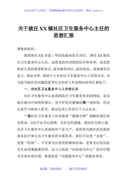/ 关于就任XX镇社区卫生服务中心主任的思想汇报