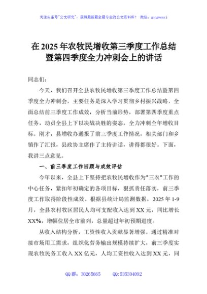 / 在2025年农牧民增收第三季度工作总结暨第四季度全力冲刺会上的讲话