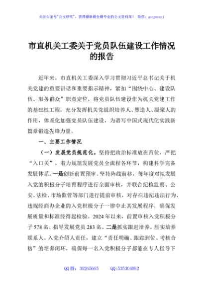 / 市直机关工委关于党员队伍建设工作情况的报告
