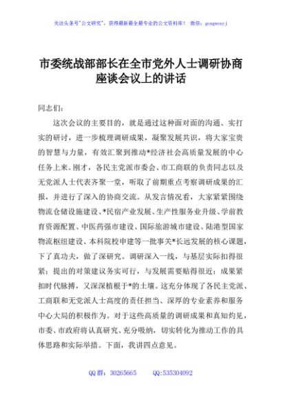 / 市委统战部部长在全市党外人士调研协商座谈会议上的讲话