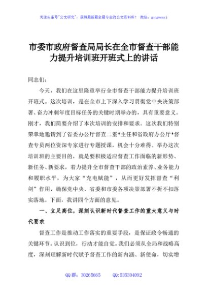 / 市委市政府督查局局长在全市督查干部能力提升培训班开班式上的讲话