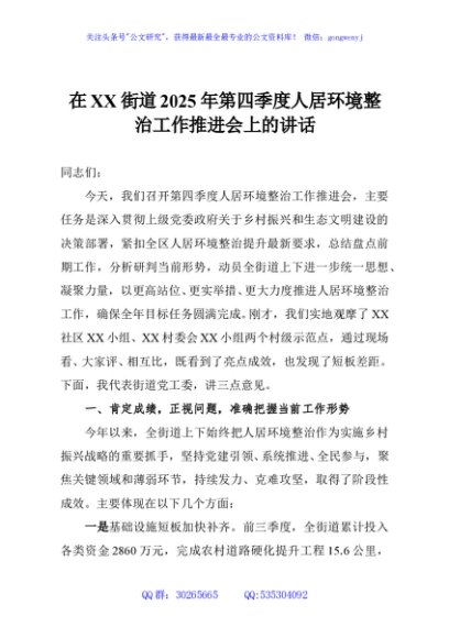 / 在XX街道2025年第四季度人居环境整治工作推进会上的讲话