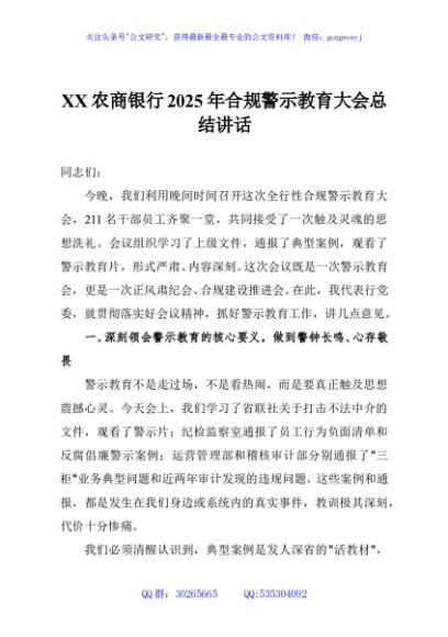 / XX农商银行2025年合规警示教育大会总结讲话