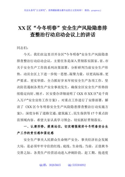 / XX区“今冬明春”安全生产风险隐患排查整治行动启动会议上的讲话