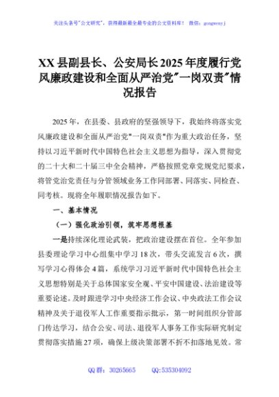 / XX县副县长、公安局长2025年度履行党风廉政建设和全面从严治党“一岗双责”情况报告
