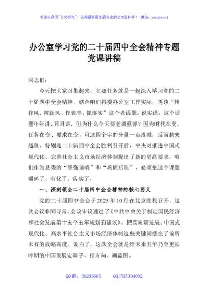 / 办公室学习党的二十届四中全会精神专题党课讲稿