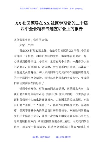 / XX社区领导在XX社区学习党的二十届四中全会精神专题宣讲会上的报告