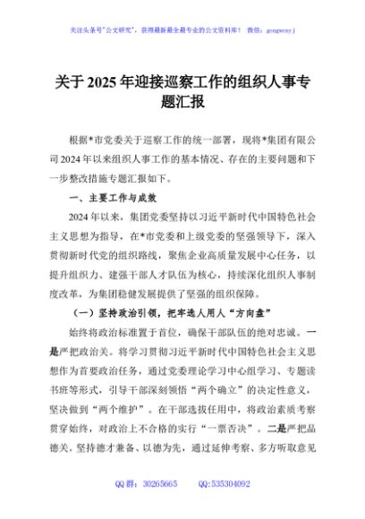 / 关于2025年迎接巡察工作的组织人事专题汇报