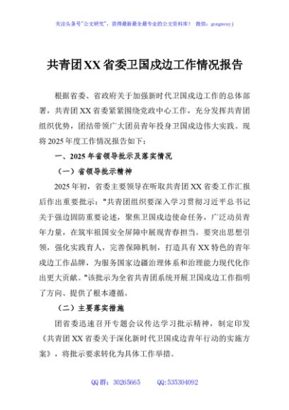 / 共青团XX省委卫国戍边工作情况报告