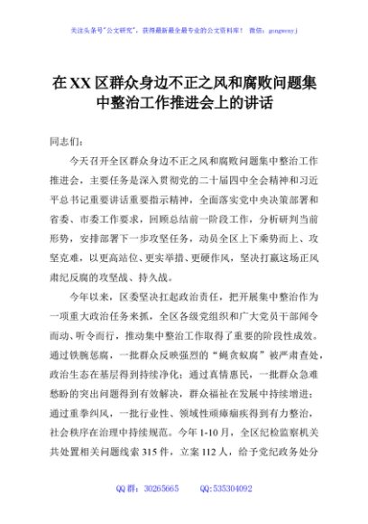 / 在XX区群众身边不正之风和腐败问题集中整治工作推进会上的讲话