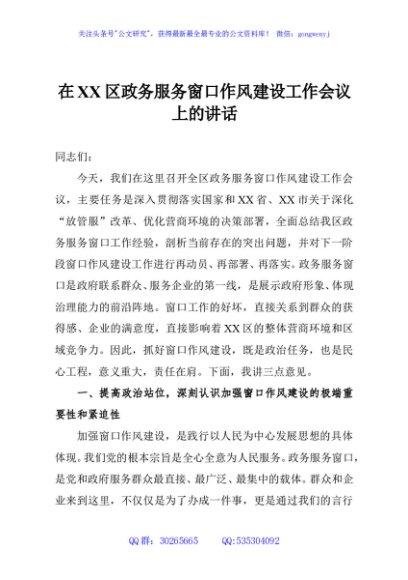 / 在XX区政务服务窗口作风建设工作会议上的讲话