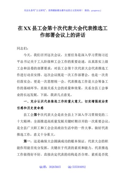/ 在XX县工会第十次代表大会代表推选工作部署会议上的讲话