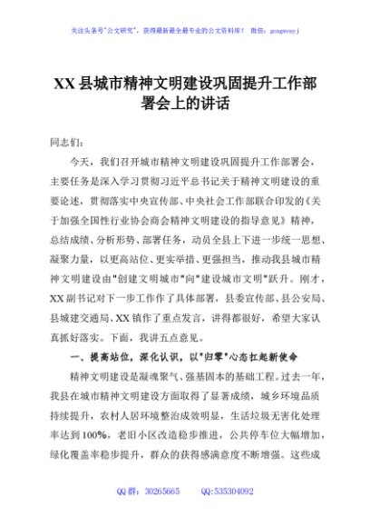 / XX县城市精神文明建设巩固提升工作部署会上的讲话
