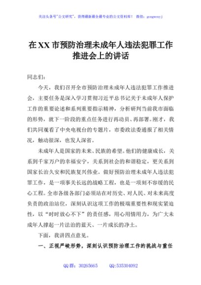 / 在XX市预防治理未成年人违法犯罪工作推进会上的讲话