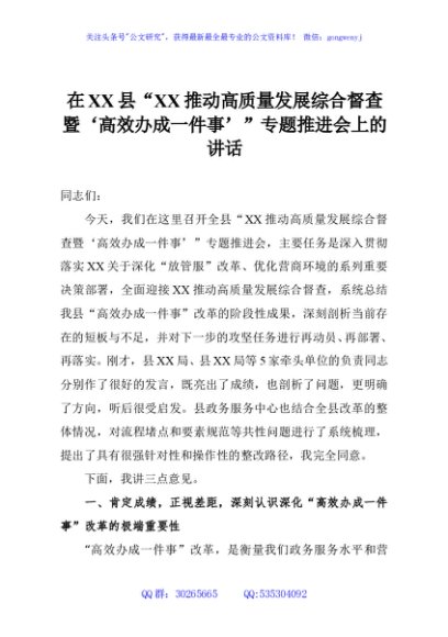 / 在XX县“XX推动高质量发展综合督查暨‘高效办成一件事’”专题推进会上的讲话