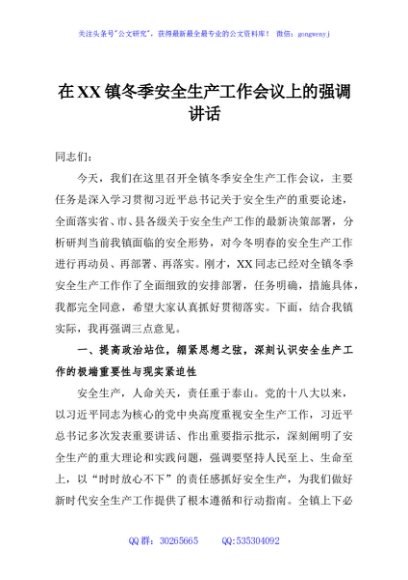 / 在XX镇冬季安全生产工作会议上的强调讲话