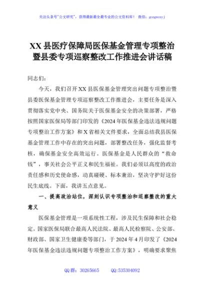 / XX县医疗保障局医保基金管理专项整治暨县委专项巡察整改工作推进会讲话稿