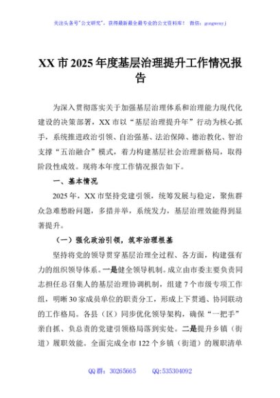 / XX市2025年度基层治理提升工作情况报告