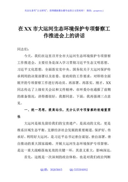 / 在XX市大运河生态环境保护专项督察工作推进会上的讲话