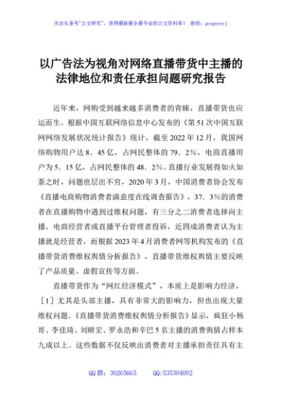 / 以广告法为视角对网络直播带货中主播的法律地位和责任承担问题研究报告