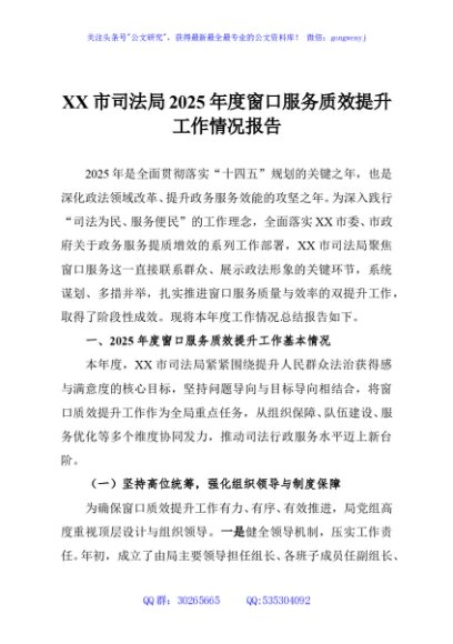 / XX市司法局2025年度窗口服务质效提升工作情况报告