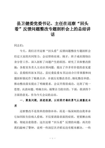 / 县卫健委党委书记、主任在巡察“回头看”反馈问题整改专题剖析会上的总结讲话