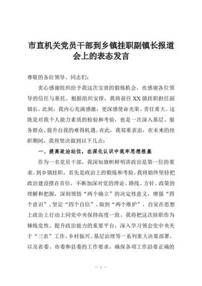/ 市直机关党员干部到乡镇挂职副镇长报道会上的表态发言