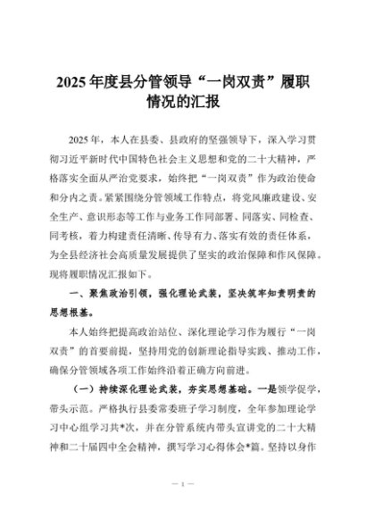 / 2025年度县分管领导“一岗双责”履职情况的汇报
