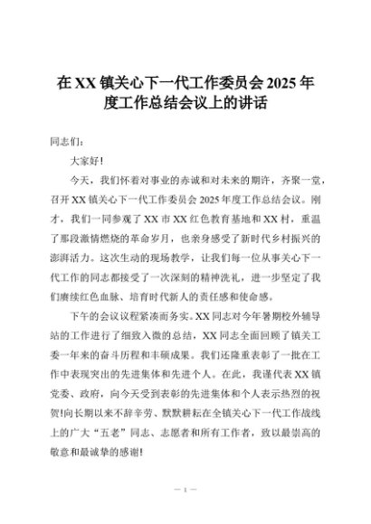 / 在XX镇关心下一代工作委员会2025年度工作总结会议上的讲话