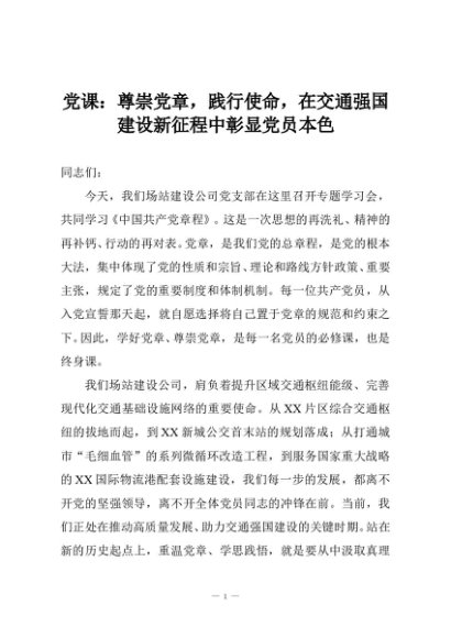 党课:尊崇党章,践行使命,在交通强国建设新征程中彰显党员本色