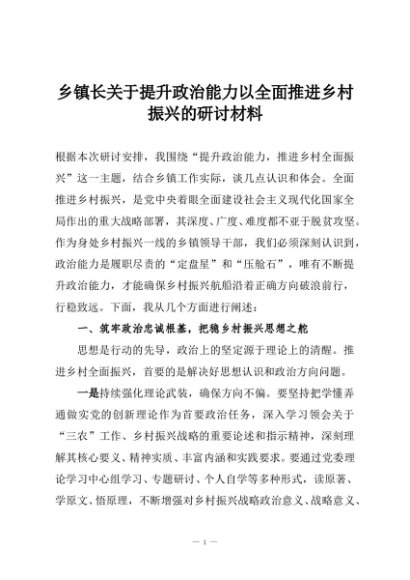 / 乡镇长关于提升政治能力以全面推进乡村振兴的研讨材料