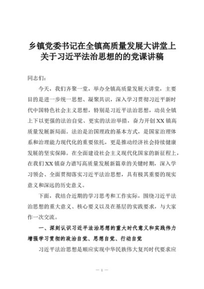 / 乡镇党委书记在全镇高质量发展大讲堂上关于习近平法治思想的的党课讲稿