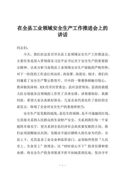 / 在全县工业领域安全生产工作推进会上的讲话