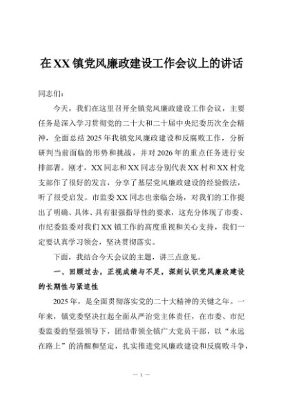 / 在XX镇党风廉政建设工作会议上的讲话