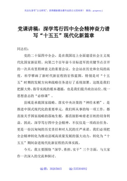 / 党课讲稿:深学笃行四中全会精神奋力谱写“十五五”现代化新篇章