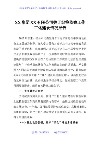 / XX集团XX有限公司关于纪检监察工作三化建设情况报告