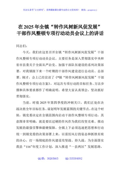 / 在2025年全镇“转作风树新风促发展”干部作风整顿专项行动动员会议上的讲话
