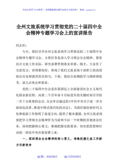 / 全州文旅系统学习贯彻党的二十届四中全会精神专题学习会上的宣讲报告