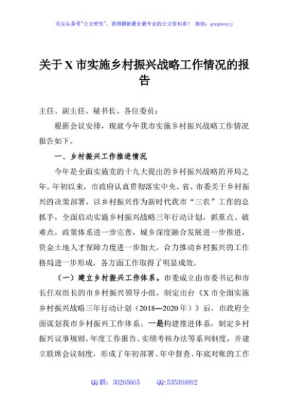 / 关于X市实施乡村振兴战略工作情况的报告