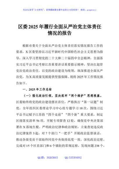 / 区委2025年履行全面从严治党主体责任情况的报告