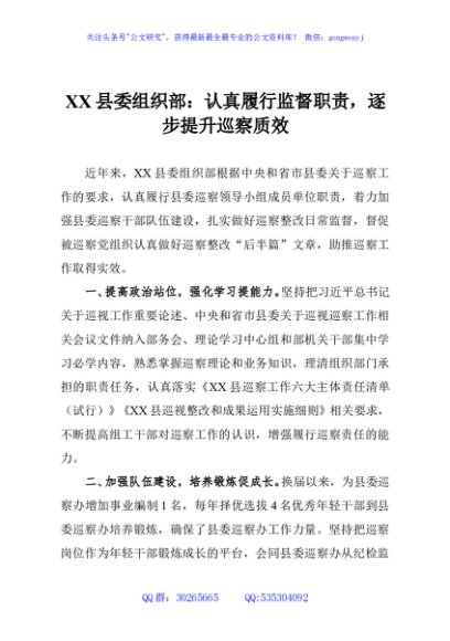 / XX县委组织部:认真履行监督职责,逐步提升巡察质效
