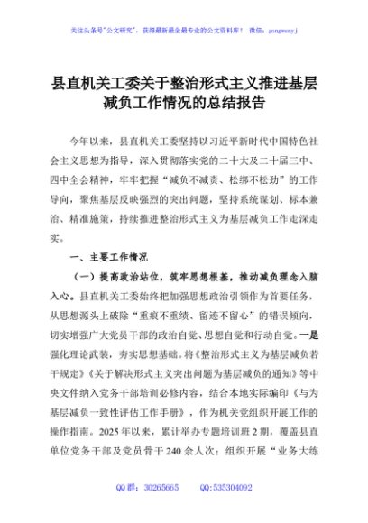 / 县直机关工委关于整治形式主义推进基层减负工作情况的总结报告