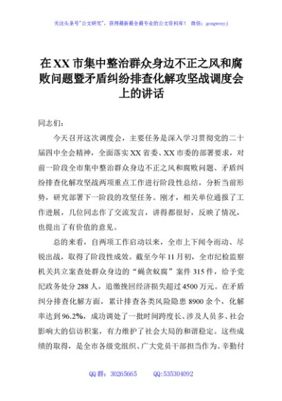 / 在XX市集中整治群众身边不正之风和腐败问题暨矛盾纠纷排查化解攻坚战调度会上的讲话