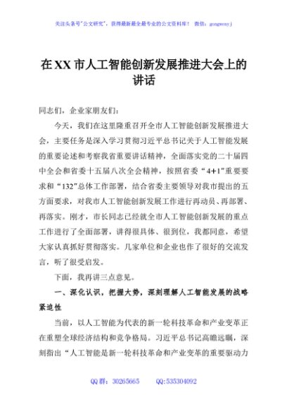 / 在XX市人工智能创新发展推进大会上的讲话