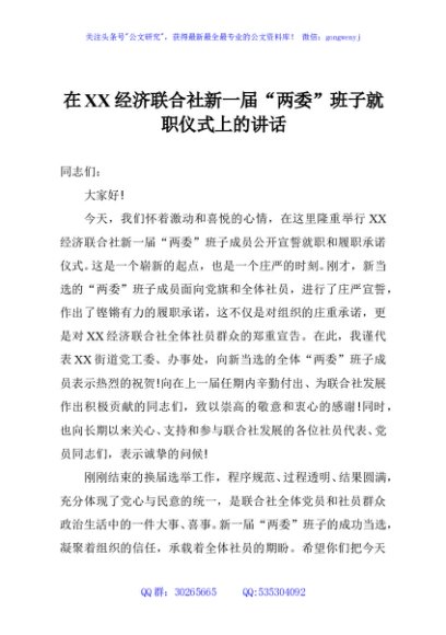 / 在XX经济联合社新一届“两委”班子就职仪式上的讲话