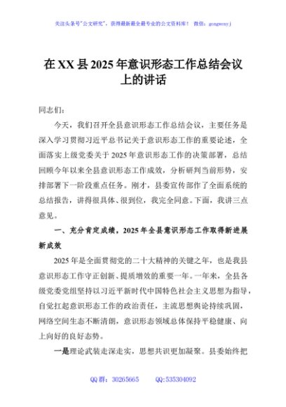 / 在XX县2025年意识形态工作总结会议上的讲话