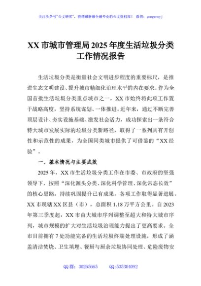/ XX市城市管理局2025年度生活垃圾分类工作情况报告