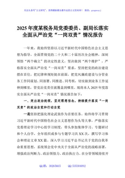 / 2025年度某税务局党委委员、副局长落实全面从严治党“一岗双责”情况报告