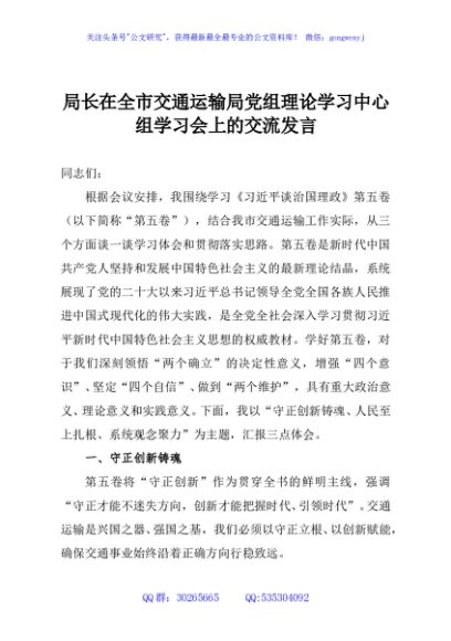/ 局长在全市交通运输局党组理论学习中心组学习会上的交流发言