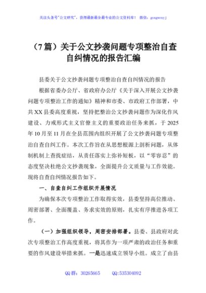 / (7篇)关于公文抄袭问题专项整治自查自纠情况的报告汇编